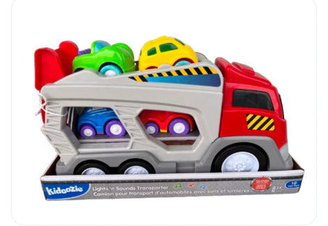 The Lights 'n Sounds Transporter provides endless play. Load and unload the 4 chunky freewheeling vehicles on the double decker transporter with ramps. Plus, light up headlights and electronic truck sounds add to the fun. Take it on-the-go with the built-in carrying handle.